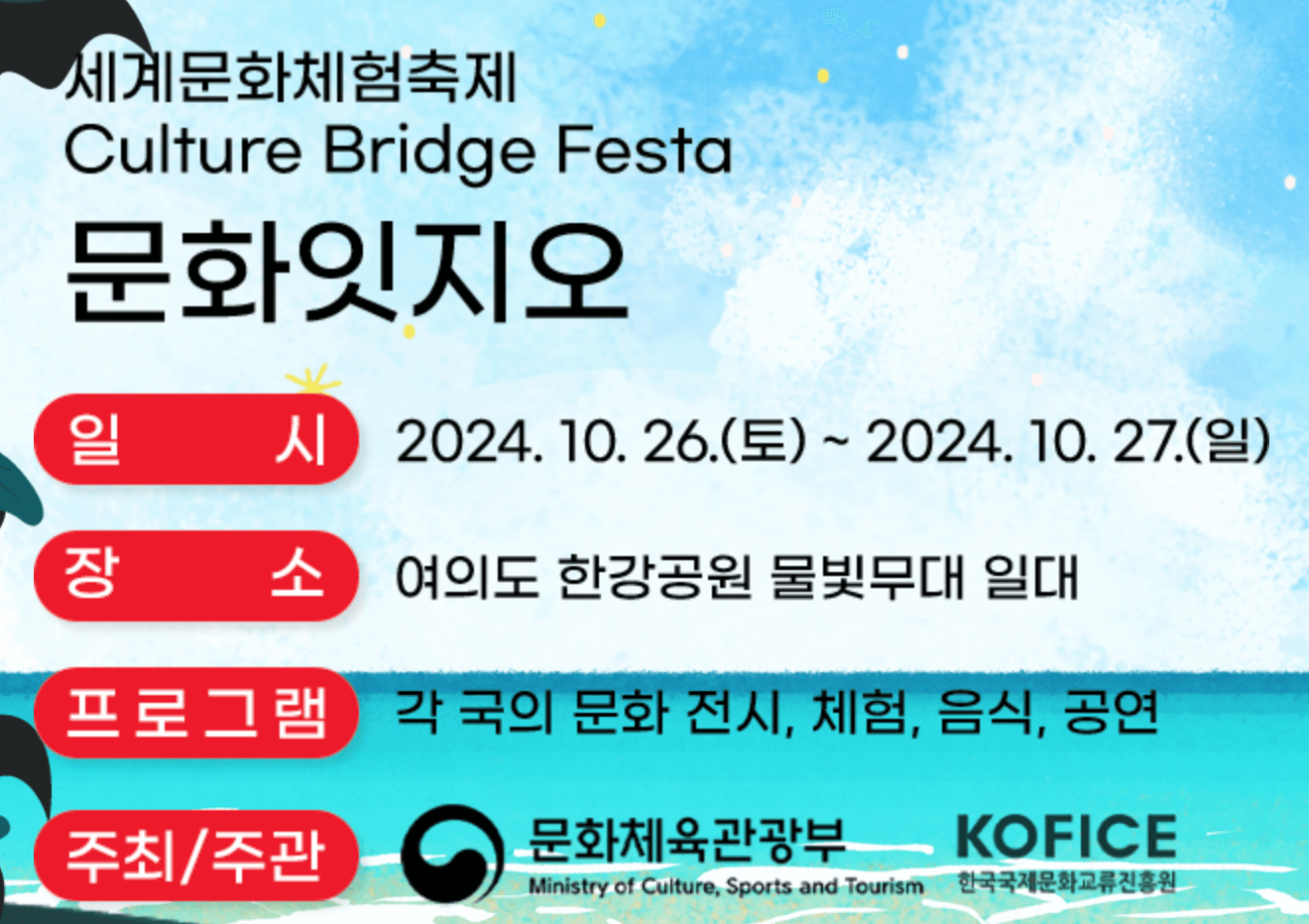 문화잇지오는 다양한 아시아와 세계 문화를 체험할 수 있는 세계문화체험축제입니다. 2024년 10월 26일(토)부터 10월 27일(일)까지 서울 여의도 한강공원 물빛무대 일대에서 열리며, 자메이카와 필리핀이 주요 초청국가로 참가합니다. 이 축제는 각국의 전통 공연, 전시, 문화 체험 프로그램 등을 통해 세계의 다양한 문화를 체험할 수 있는 기회를 제공합니다.