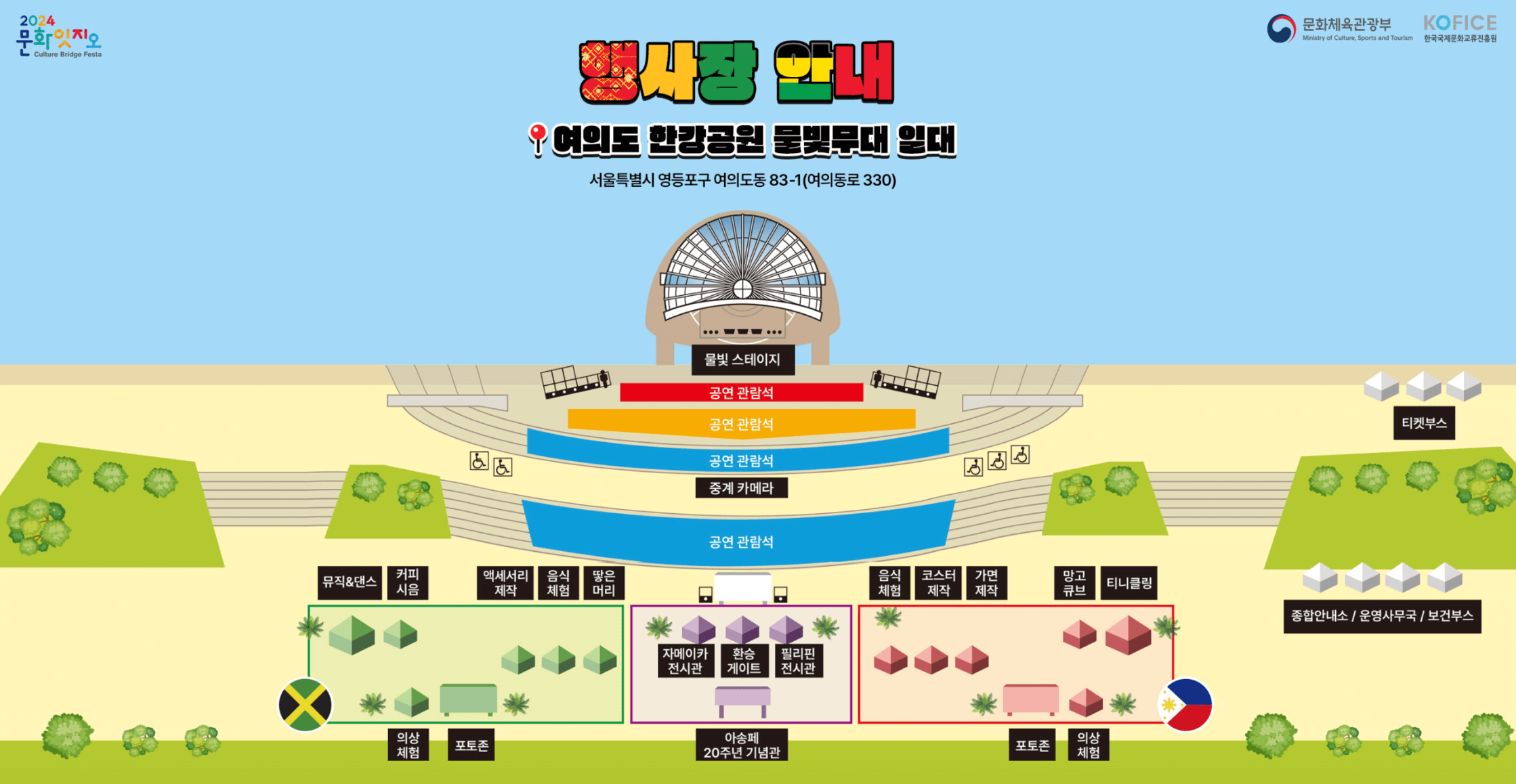 주요 프로그램으로는 자메이카의 레게 음악을 대표하는 스컬&하하, 필리핀 전통 민속 공연팀 라몬 오부산 민속 공연단 등의 공연이 있으며, 관람객들은 다양한 전시와 체험 부스도 즐길 수 있습니다. 축제는 전석 무료로 제공되며, 네이버 예약을 통해 사전 예매가 가능합니다